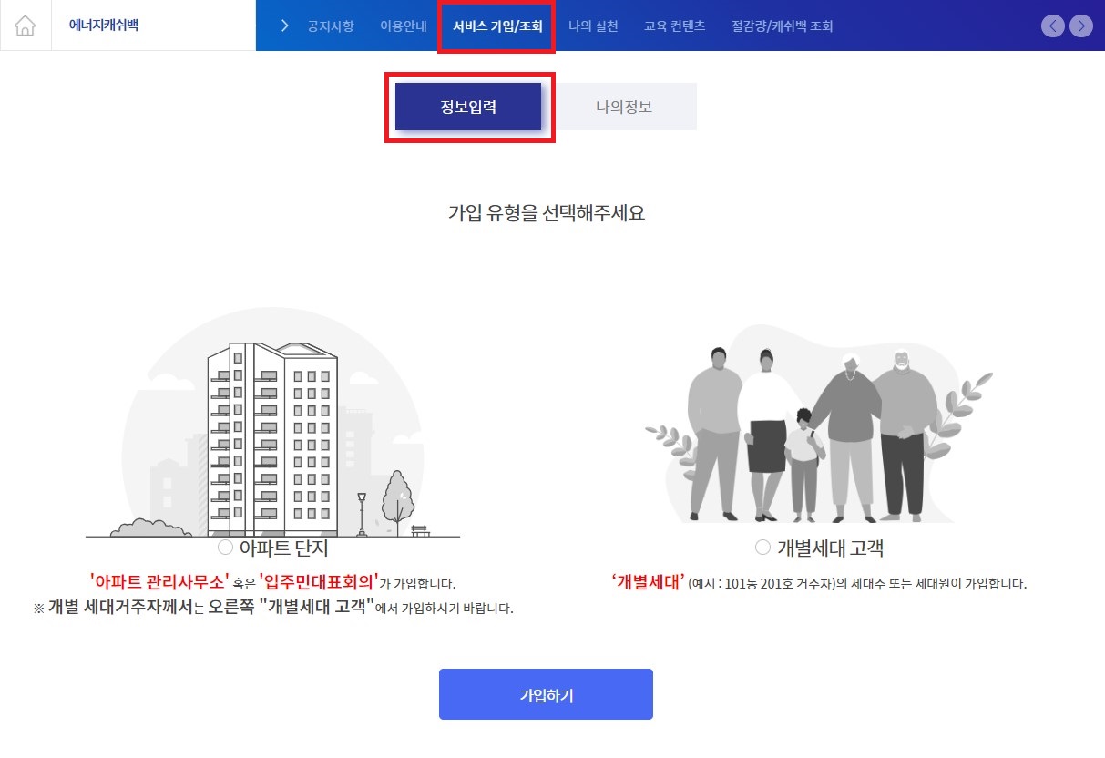 정보입력에서 '아파트 단지'인지 '개별세대 고객' 인지 선택하여 가입